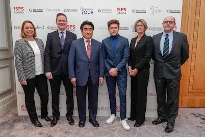 - 半田晴久ISPS会長、ナイル・ホーラン、欧州のゴルフ関係者、カースティ・ギャラチャー(英国のテレビ司会者兼モデル)
