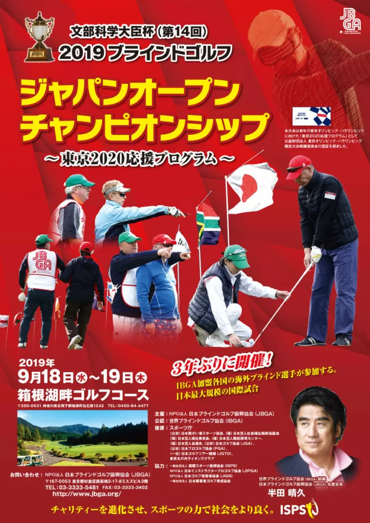 日本ブラインドゴルフ振興協会(JBGA)が主催する視覚障がい者のゴルフ競技会「文部科学大臣杯(第14回) 2019 ブラインドゴルフ ジャパンオープン チャンピオンシップ」が9月18、19日の2日間、神奈川県箱根町の箱根湖畔ゴルフコースで開催された。日本最大規模の国際大会で世界6カ国から59選手が参加。熱戦を繰り広げた。今年は東京五輪・パラリンピックを翌年に控え「東京2020応援プログラム」の一環としても開催され、将来の五輪種目へとつなげる重要な大会となった。なお大会はマーク・エシュバンク選手(豪州)が優勝した。