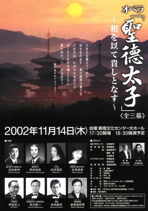 オペラ「聖徳太子」は、聖徳太子の前半生を描いたオリジナルオペラです。聖徳太子の言い伝えに、多少、新たな視点が加わり、物語が構成されています。