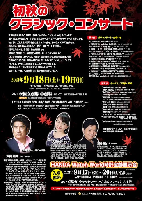 明日9月18日と19日は、東京芸術財団・世界芸術文化振興協会主催「初秋のクラシックコンサート」が新国立劇場で開催されます。
